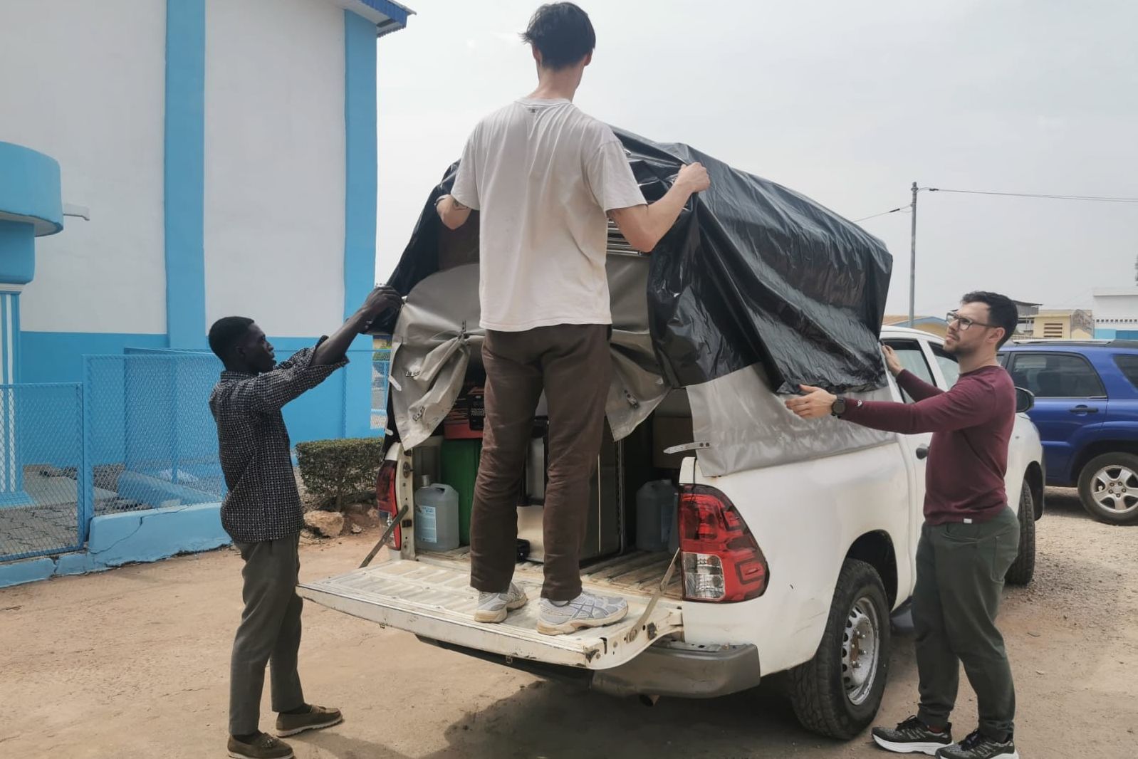Die letzten Materialien für die Kohortenstudie werden verladen und sind bereit für den Transport nach Taï. Einige Ausrüstungsgegenstände und Verbrauchsmaterialien haben wir vor Ort gekauft, andere stammen aus unserem ständigen Lager in Abidjan oder wurden aus Deutschland geliefert – ein mehrmonatiger Prozess sorgfältiger Vorbereitung.